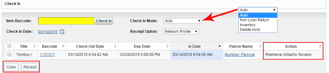 The check in screen retains a list of all checked-in materials until you click the Clear button. You may also print a receipt for a patron if they so desire by clicking on the Receipt button. This button will print a receipt for all items on the list that have boxes checked.