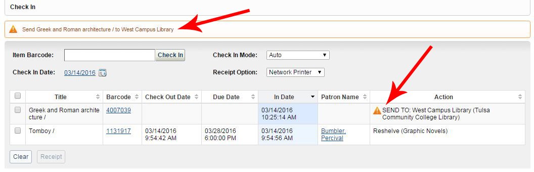 Pay attention to the Action column on the far right. It will tell you what needs to be done with the item you have just checked in. Normally the item will just need to be reshelved, but sometimes an item will need to be routed to another campus or placed on the Holds shelf.