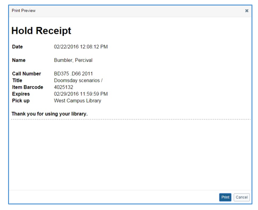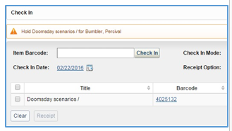 To process go to the Check In screen and check in the item. This will generate a Hold Receipt. Print the receipt and put it in the book. If the item is going to another campus, a pop-up will appear. Process with the correct courier slip. If the item is to be picked up at your campus, place the item on the Hold Shelf. Checking the item in also alerts the patron (via email) that their request is being processed.