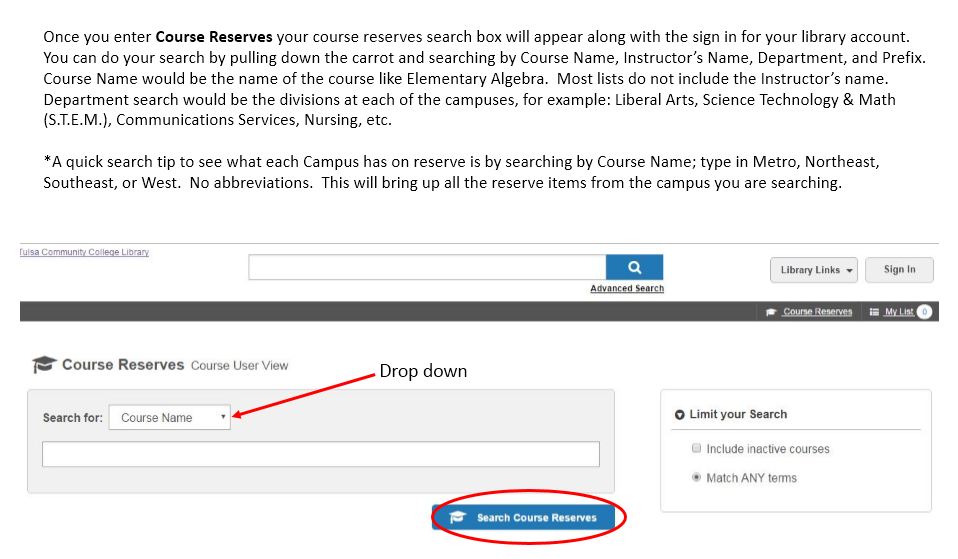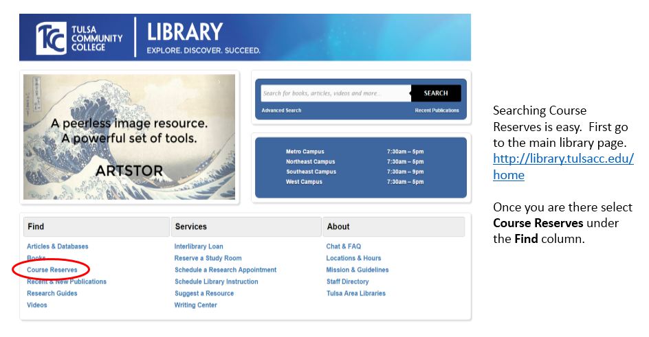 Metro Campus Library: 918.595.7172 | Northeast Campus Library: 918.595.7501 | Southeast Campus Library: 918.595.7701 | West Campus Library: 918.595.8010