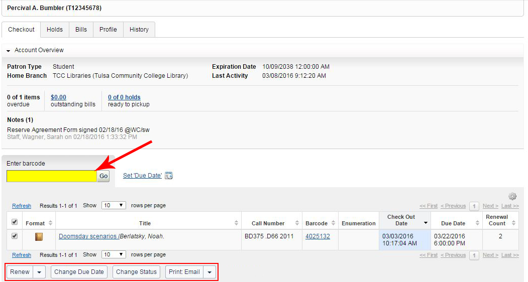 Once you have pulled up a patron's record you can type or scan the barcode number of the book into the Enter barcode box.